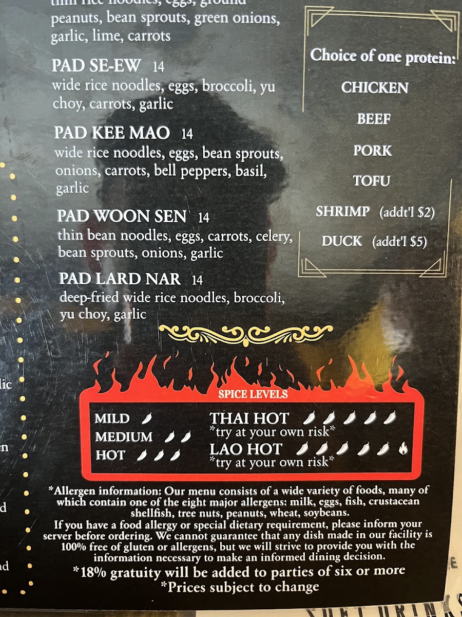 wide rice noodles stir-fried with eggs, bean sprouts, onions, carrots, bell peppers, basil, and garlic in a brown soy-based sauce *These noodles are NOT GLUTEN-FREE. **Picking a spice level below is OPTIONAL. If you do not pick one, the dish will be made without additional spice.